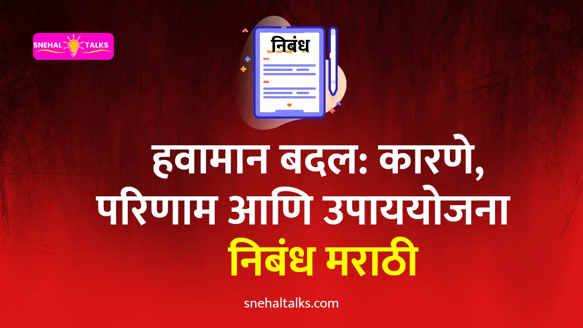 हवामान बदल – कारणे परिणाम आणि उपाययोजना : मानवजातीच्या इतिहासात निसर्ग आणि माणूस यांचे नाते अत्यंत जवळचे राहिले आहे. पृथ्वीवरील जीवन टिकून राहण्यासाठी हवा, पाणी, माती, वनस्पती आणि प्राणी यांचे संतुलन अत्यंत आवश्यक आहे. परंतु गेल्या काही दशकांत मानवी विकासाच्या वेगामुळे निसर्गाच्या संतुलनावर मोठा परिणाम झाला आहे. औद्योगिकीकरण, वाढती लोकसंख्या, जंगलतोड आणि प्रदूषण यामुळे पृथ्वीचे … Read more